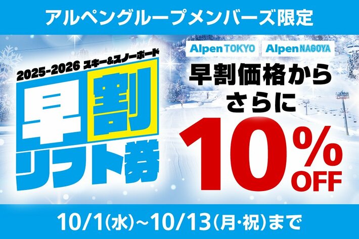 スポーツ用品販売の株式会社アルペン(本社:愛知県名古屋市、代表取締役社長:水野敦之)は、2025/2026シーズンの早割リフト券を2025年10月1日(水)より販売を開始いたします。さらに、Alpen TOKYO、Alpen NAGOYAの2店舗では、早割リフト券がさらに10%OFFとなるお得な企画を2025年10月1日(水)から2025年10月13日(月・祝)の期間にアルペングループメンバーズ限定で実施いたします。