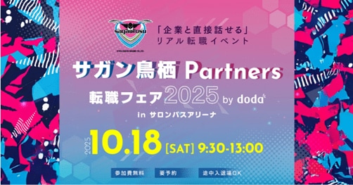 転職サービス「doda」などを提供するパーソルキャリア株式会社(本社:東京都港区、代表取締役社長:瀬野尾 裕)は、株式会社サガン・ドリームス(本社:佐賀県鳥栖市、代表取締役:小柳智之)と、サガン鳥栖のパートナー企業をはじめ、九州エリアの企業が参加する「サガン鳥栖Partners 転職フェア 2025 by doda」を、10月18日(土)に共同開催することをお知らせいたします。