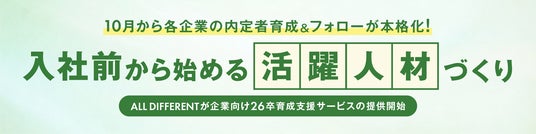 累計20,000社450万人以上の組織開発・人材育成を支援するALL DIFFERENT(オールディファレント)株式会社(所在地:東京都千代田区 代表取締役社長:眞崎大輔)は、10月1日より、2026年度入社予定の内定者を対象とした育成支援サービスの提供を開始します。学生から社会人へと大きな転換期を迎える内定者が、不安なく入社式を迎え、社会人として最高のスタートが切れるよう、内定者研修や学習アプリなどを通じて内定者の成長をサポートします。