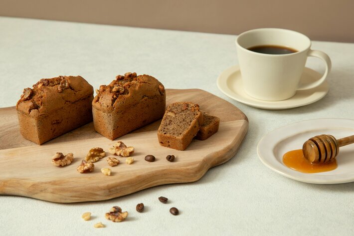 国産有機米粉を生かしながら、米粉特有の重さを感じさせず、しっとり口どけよく仕上げたパウンドケーキ。挽きたてコーヒーが香る生地に、有機メープルシロップでキャラメリゼしたローストくるみの香ばしさが際立って、コーヒー好きも大満足の味わいに。甘味料には、白砂糖の代わりにニュージーランド産生はちみつとてんさい糖を使用しています。はちみつ専門店ならではのオリジナルレシピで、朝食やおやつに活躍します。