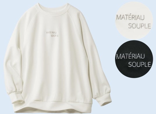 トレンド感のある小ぶりのロゴ(意味:柔らかい素材)がアクセント。肩まわりゆったりのラグラン袖プルオーバー。