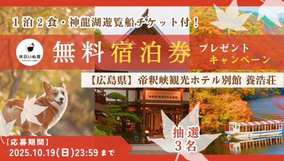 株式会社イオレ(本社:東京都中央区、代表取締役社長:瀧野 諭吾、以下イオレ)が運営するペット旅行専門メディア「休日いぬ部」は、『帝釈峡観光ホテル別館 養浩荘』様のご協賛のもと、無料宿泊券が当たるプレゼントキャンペーンを開催いたします。今回ご提供いただくのは、紅葉シーズンに人気の【神龍湖遊覧船チケット付】宿泊プラン。静かな湖畔を巡る神秘的な船旅とともに、2025年7月より新たにスタートした愛犬と泊まれる専用客室での滞在をお楽しみいただけます。さらに、神石牛をはじめとした地元食材を使った会席料理をご用意。帝釈峡ならではの景観と紅葉を眺めながら、愛犬と一緒に充実した時間をお過ごしいただけます。この機会にぜひご応募ください。