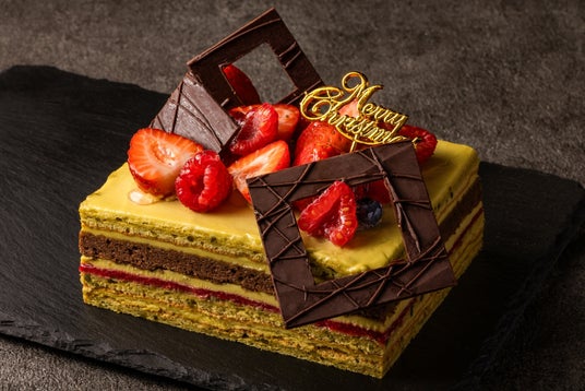 今年初登場の『オペラ ピスターシュ ドゥ ノエル』は、濃厚なピスタチオのコクを堪能できる大人好みの一品。香ばしいアーモンド生地にピスタチオバタークリームを重ね、中央にはフランボワーズのジュレを忍ばせ、華やかで奥行きのある味わいに仕上げました。