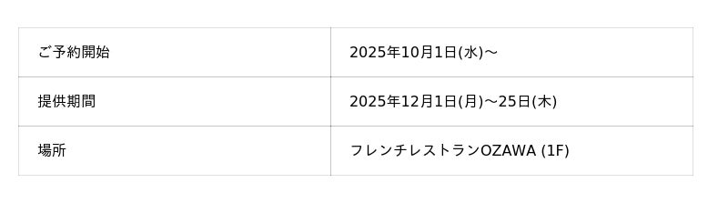 オリエンタルホテル広島(所在地:広島市中区田中町6-10)では、3種類のクリスマスケーキと、フレンチレスランOZAWAで楽しむクリスマスランチ&ディナーの予約受付を2025年10月1日(水)より開始いたします。