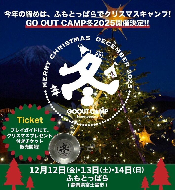 クリスマス気分を楽しめる冬キャンプフェス「GO OUT CAMP 冬 2025」を、2025年12月12日(金)~14日(日)の3日間、ふもとっぱら(静岡県富士宮市)にて今年も開催します!!