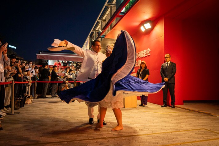 ペルーパビリオン前で、伝統舞踊「マリネラ」を披露