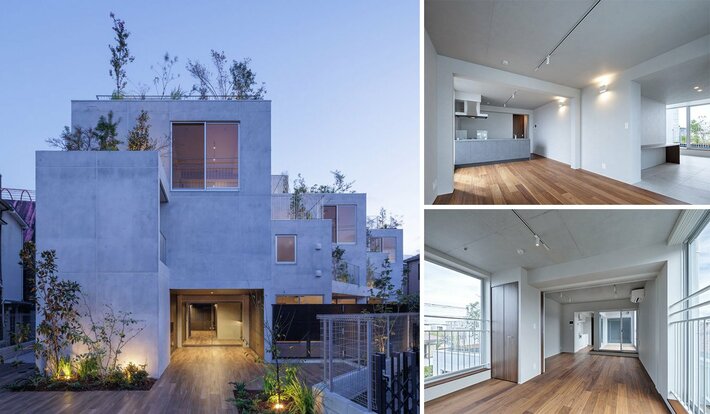 本物件は、街並みに馴染むよう、複数の小さな箱を重ね合わせながら集合させた小さな丘のような集合住宅です。小さな箱は生活を考えるのにちょうど良い約8畳(4坪)の大きさで構成しており、この箱を幾つか組み合わせることで異なった性格の空間を構成するとともに、積まれた箱の上部は庭となるよう設計しております。