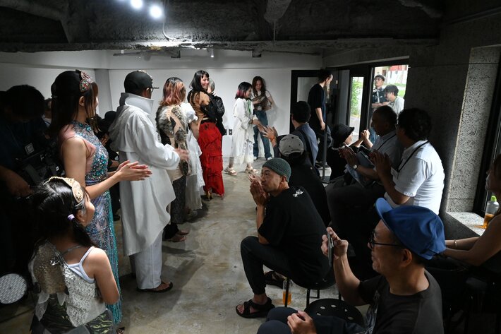 ファッションデザイナー・石岡美久が制作した独創的な衣装を来場者がその場で身にまとい、1階の「実験室」がランウェイに。来場者は、縄文芸術文化財団による演奏の中、振付家/ダンサー・平原慎太郎による個性的な振付(ポージング)を披露。プロのアーティストと来場者が一体となった、即興的で創造的な空間が生まれました。