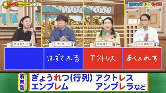 正解は「ぎょうれつ(行列)」「アクトレス」「エンブレム」「アンブレラ」など。「アクトレス」と答えた大島さんと井上さんの2人が正解。