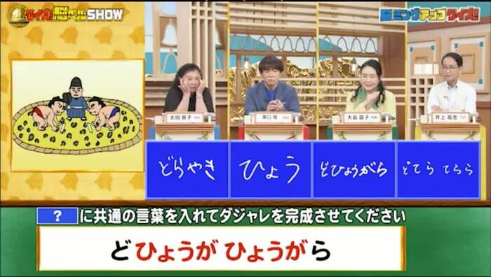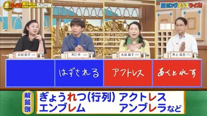 今回の解答者は、歌手で声優の太田貴子さん(54)、芸人の濱口優さん(50)、女優の大島蓉子さん(69)、俳優の井上高志さん(72)の4名です。