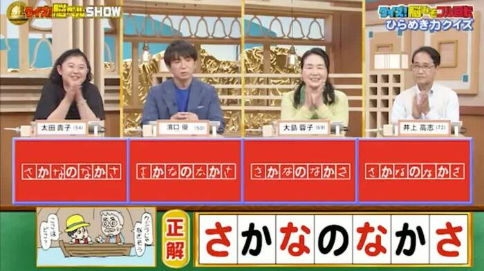 今回の解答者は、歌手で声優の太田貴子さん(54)、芸人の濱口優さん(50)、女優の大島蓉子さん(69)、俳優の井上高志さん(72)の4名です。