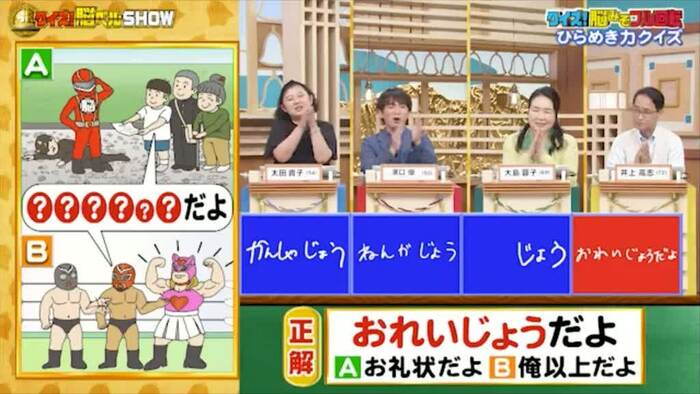 正解は「おれいじょうだよ(お礼状だよ/俺以上だよ)」。井上さん1人が見事正解!