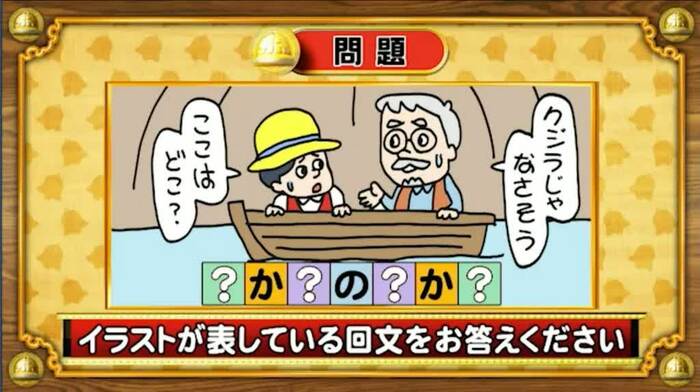 次は、イラスト回文の問題。次のイラストが表している回文を答えてください。
