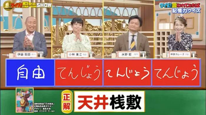 今回の解答者は、元ラグビー選手の伊藤剛臣さん(51)、女優の小林美江さん(52)、俳優の水野哲さん(57)、漫才師の林家カレー子さん(73)の4名です。