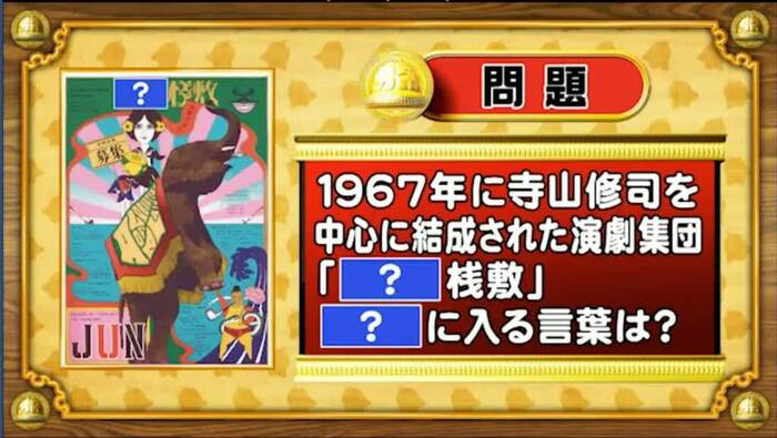 最後は、なつかし劇団の問題。今から55年前の1967年、この年に寺山修司さんを中心に結成された演劇集団は「[?]桟敷」でしょうか?
