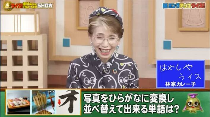 正解は「ハヤシライス(すし+や+はらい)」。小林さんと水野さんが正解。
