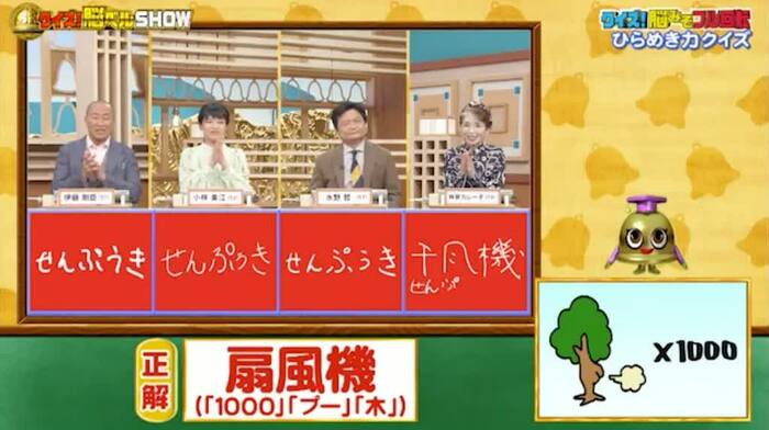 正解は「扇風機(『1000』『プー』『木』)。見事全員正解!