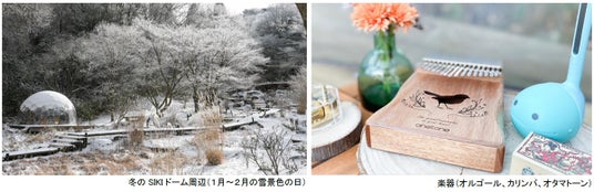 こたつのあるSIKIドームを11:00から16:00まで1日2組限定で貸切利用できます。ドーム内から冬の「SIKIガーデン~音の散策路~」の風景を眺めたり、備え付けのオルゴールやカリンバ、オタマトーンなどの楽器の演奏体験やボードゲームや本を楽しんだりと、思い思いののんびりした時間が過ごせます。