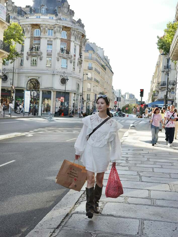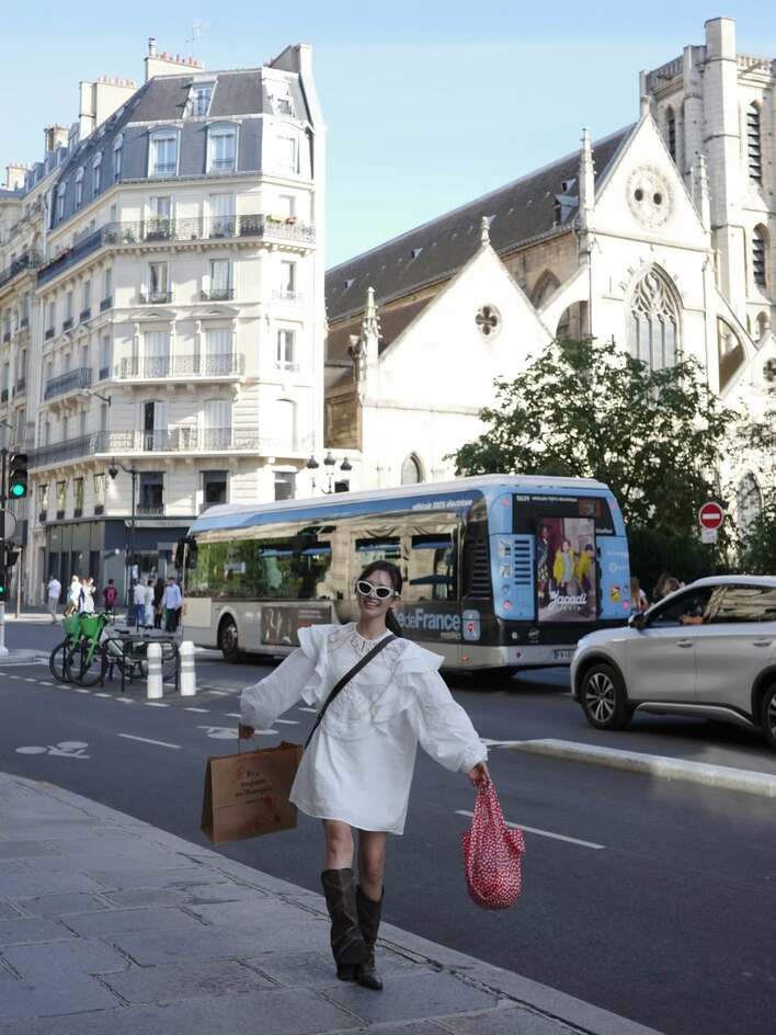 写真には、ミニ丈の白いワンピースにサングラスを頭に乗せ、美しいパリの街並みを歩く兒玉さん。蚤の市で買ったものでしょうか…両手に買い物袋を下げています。
