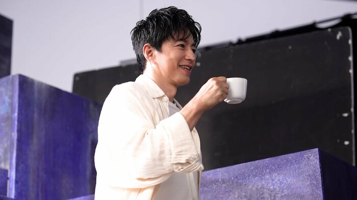 撮影が行われた当日、幻想的な青の世界をイメージしたセットに映えるホワイトコーデでスタジオに現れた大沢さん。スティックの箱を手にやさしく微笑むシーンでは、やわらかな表情の中にも芯がある真摯なまなざしで、その様子をスタッフも息を飲んで見守ります。