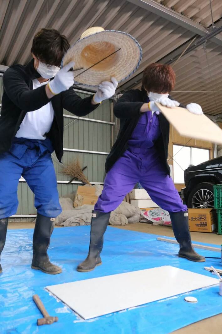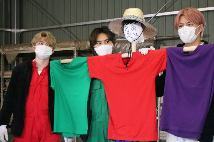 木材の固定を終えた3人はかかしの装飾工程へ。“赤いTシャツと麦わら帽子”をかぶせてみますが、あるキャラクターにそっくりになってしまい一同は大爆笑。さらにタカシさんが「ちょっと、これ…(笑)」と迷いを見せたり、タクヤさんが「お前、何やってんだよ(笑)!」とあるメンバーへツッコミを入れたりと、作業はどんどんカオスな展開へ突入していきます。