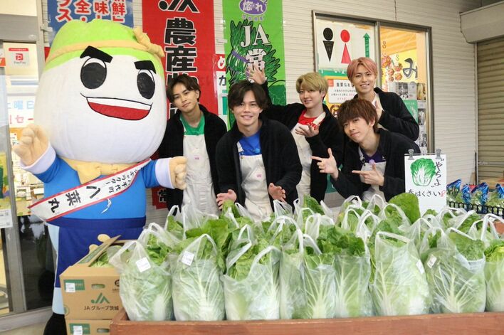 続いて、一同は野菜の直売所へと移動。今回の体験日の朝に収穫していた白菜を、超特急がみずから手売りで販売します。