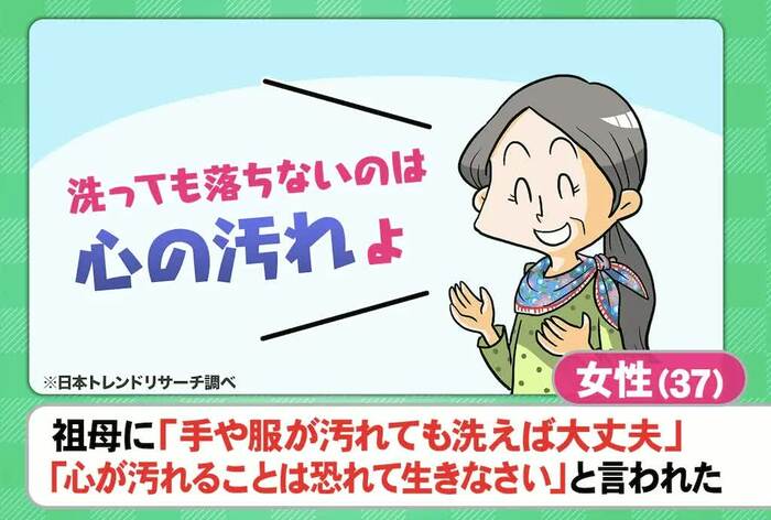 まず紹介されたのは、「幼稚園のとき、祖母から『手や服の汚れは洗えば落ちる。洗っても落ちないのは、心の汚れ』と言われたことが忘れられない」という37歳女性のエピソード。