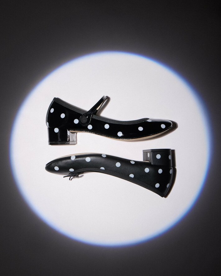 完成したシューズには、ハイドロディッピング(水圧転写)技術によって、グラフィカルなポルカドット柄が施され、レペットの時代を超越したエレガンスと、コム デ ギャルソンの視覚的な実験精神が融合することで、それぞれが唯一無二の作品へと昇華しました。