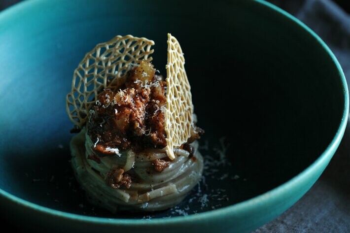滋味深い自然薯をパスタに「クーガ芋のキタッラ 軟骨ソーキのラグー」