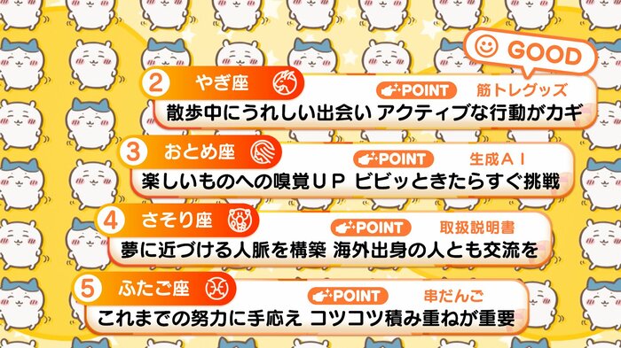 『めざましテレビ』で放送中の「ちいかわ占い」 テレビ放送がない日はお休みで、月~土:朝7時以降に更新予定です。