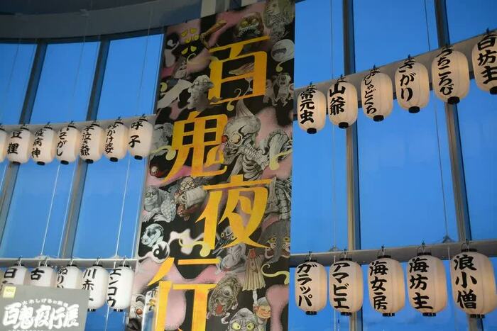 「天空の水木しげるロード」と名付けられたエントランスの大きな窓には、妖怪の名前が書かれた提灯がずらり。その下には水木さんの出身地である鳥取県境港市に並ぶブロンズ像と同じ妖怪たちが並びます。