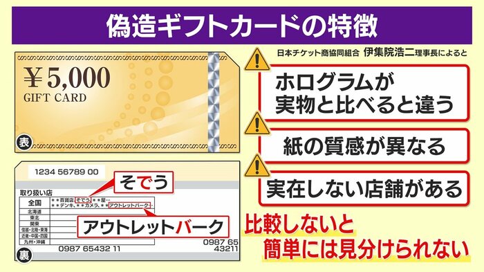 新たに持ち込まれた“偽造ギフトカード”は、ショップのプロがさわっても判別が難しい精巧な作りだったといいます。しかし、裏面をよく見てみると“ある違和感”が…。