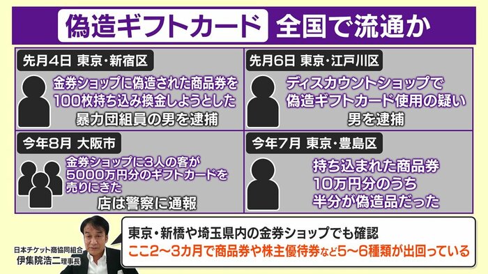 日本チケット商協同組合の伊集院理事長によると、このような偽造ギフトカードは、東京の新橋や埼玉県内の金券ショップでも確認されており、この2~3カ月でギフトカードや株主優待券など5~6種類が出回っているといいます。