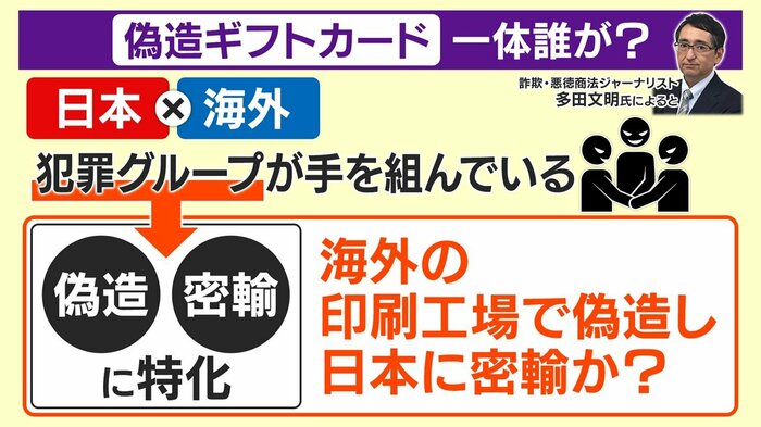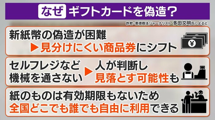 詐欺・悪徳商法ジャーナリストの多田文明氏によると、近年、偽造ギフトカードが増えている理由として、「新紙幣になって紙幣の偽造が難しくなった」「ホログラムや紙質に違いがあっても一般人では見分けられない」「レジを通す必要がない」「全国で広く利用できる」などが挙げられ、日本の犯罪グループと海外の犯罪グループが手を組んだ、偽造や密輸に特化したグループが海外の印刷工場で偽造して日本に持ち込んでいるといいます。
