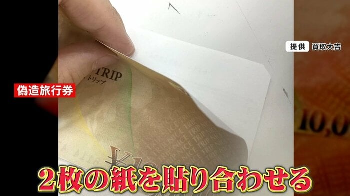 一枚の紙でできているはずの旅行券が、2枚の紙を貼り合わせたものだったのです。店側は、“偽造された旅行券”だと判断し買い取りを拒否。