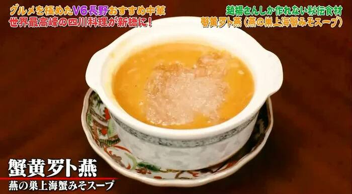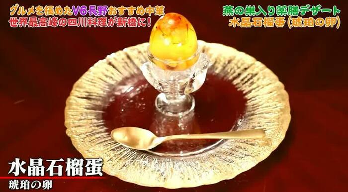 水晶の飾り石をイメージした、四川料理の薬膳知識が詰まった宝石のようなデザートはあまりに水晶に似た見た目に「写真のまんまだ」と驚きの声が上がる。そして2品目のスープで食べられなかった「燕の巣」も入っている一品だ。