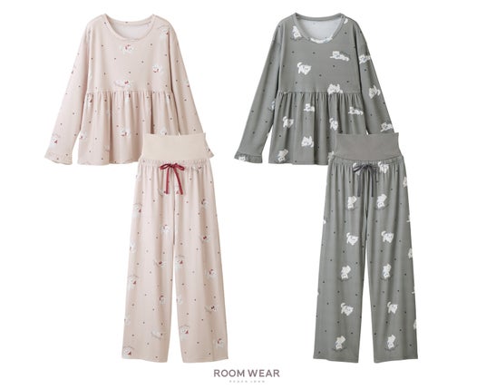 ゆったりしたシルエット、ふっくらボリュームのあるパフスリーブのトップ、ゆとりのあるストレートシルエットのボトムで、おうち時間をリラックスして過ごせる仕様。トップスの袖口付近に配したハート柄がポイントです。