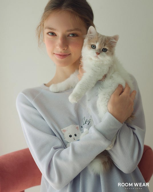 毎年大好評のPEACH JOHN ROOMの冬の定番、ホイップクリームのように柔らかな肌ざわりとあたたかさのモールニット、「ホイップリー」素材のパジャマ。リボンを結んだ、キュートな子猫のジャカード柄入りです。