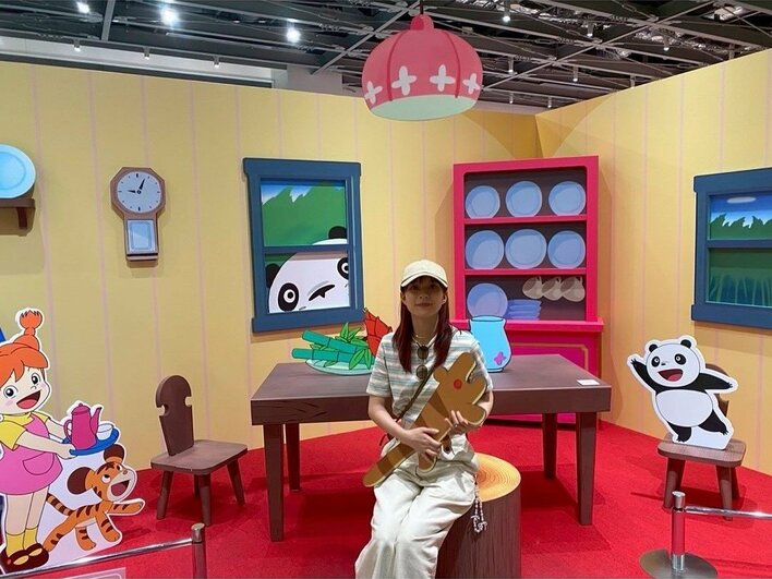 お父さんパンダの「パパンダ」がオールを持ち、主人公の「ミミ子」や子パンダの「パンちゃん」とともにベッドの小舟に乗っているシーンを再現したフォトスポットで、ガッツポーズを高くかかげたショットなどを披露し、「とにかく大興奮でした!!」と、嬉しそうな様子を見せています。
