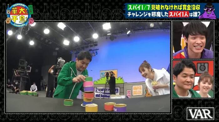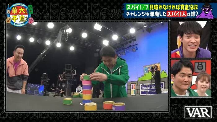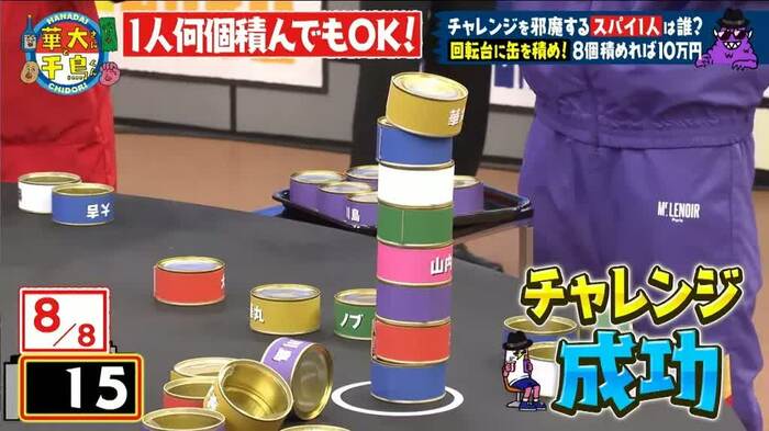 予想以上に缶を積むことに苦戦し、何度も倒してしまう一同。失敗する人が続出したため「容疑者多すぎる!」と大混乱。