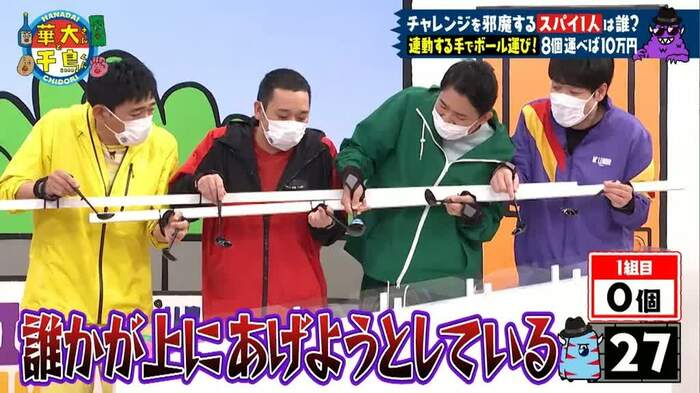 1組目の川島さん、華丸さん、ノブさん、大悟さんが挑戦すると、「誰かが!」「変な力入ってるって!」と声が上がり大騒ぎに。