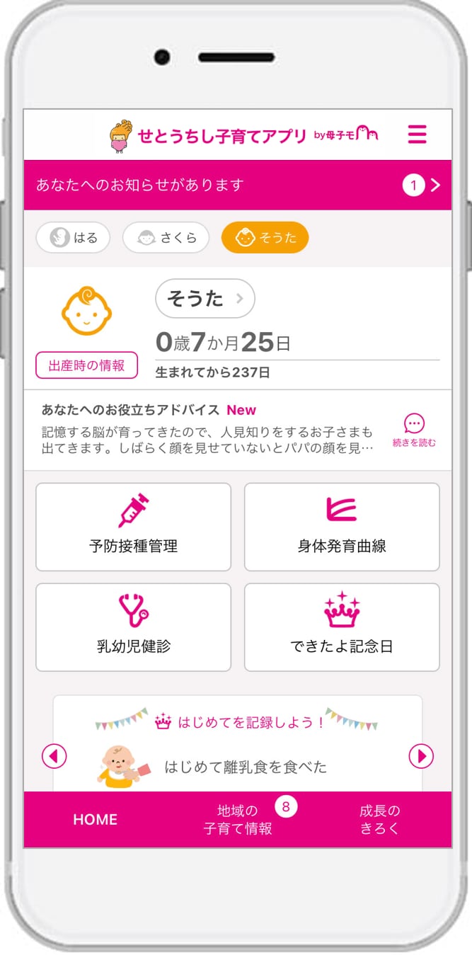 瀬戸内市に採用された『せとうちし子育てアプリ』は、スマートフォン・タブレット端末・PCに対応したサービスで、妊婦と子どもの健康データの記録・管理や予防接種のスケジュール管理、出産・育児に関するアドバイスの提供、離れた地域に住む祖父母など家族との共有機能や、市が配信する地域の情報をお知らせするなど、育児や仕事に忙しい母親や父親を助けてくれる便利な機能が充実しています。