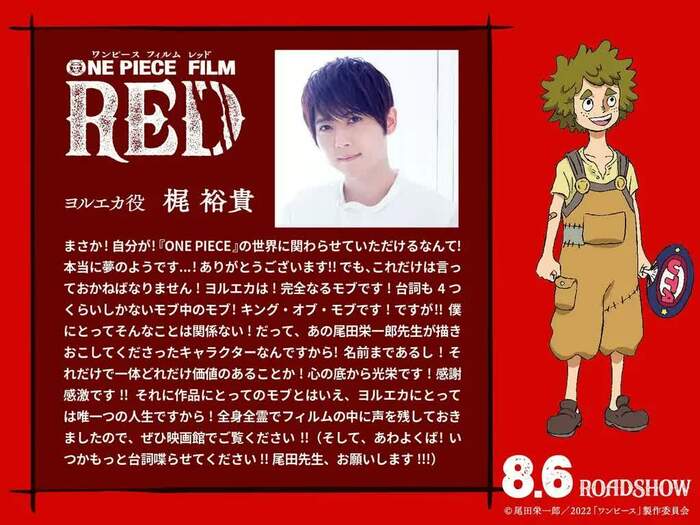 今回の出演を受け、「まさか!自分が!『ONE PIECE』の世界に関わらせていただけるなんて!本当に夢のようです…!ありがとうございます!!でも、ヨルエカは!キング・オブ・モブです!ですが!僕にとってそんなことは関係ない!だって、あの尾田栄一郎先生が描きおこしてくださったキャラクターなんですから!それだけで一体どれだけ価値のあることか!」(コメント一部抜粋)と、原作愛溢れる様子で出演を心から喜びました。