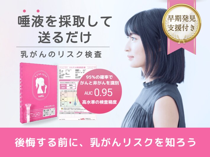 ミルテルのスキャンテスト乳がんは、唾液に含まれるポリアミンという成分が乳がん罹患者の中で増加することに着目し、唾液中のポリアミンの検出、解析を行い、乳がん罹患者特有のポリアミンのバランスと照合することで乳がんの罹患リスクを判定しています。