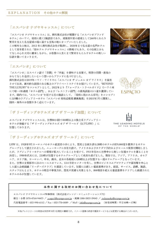 エスパシオエンタープライズ株式会社(所在地:名古屋市中区錦三丁目23番18号)が運営する「エスパシオ ナゴヤキャッスル」(所在地:名古屋市西区樋の口町3番19号)は、2025年10月1日(水)、興和株式会社が展開するエスパシオブランドのハワイ、箱根に次いで3つ目のホテルとして新たな歴史を刻むセレモニーを執り行い、開業いたしました。