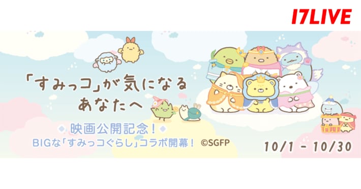 17LIVE株式会社(東京都渋谷区、代表取締役:ジャン・ホンフイ、URL:https://jp.17.live/)が運営する日本最大級のライブ配信アプリ「17LIVE(イチナナ)」は、幅広い世代に大人気のキャラクターとして、2025年10月31日(金)に『映画 すみっコぐらし 空の王国とふたりのコ』の公開が決定している「すみっコぐらし」と初となる映画公開を記念したコラボレーションイベント、『「すみっコ」が気になるあなたへ』を、2025年10月1日(水)より開催することが決定しましたので、お知らせいたします。