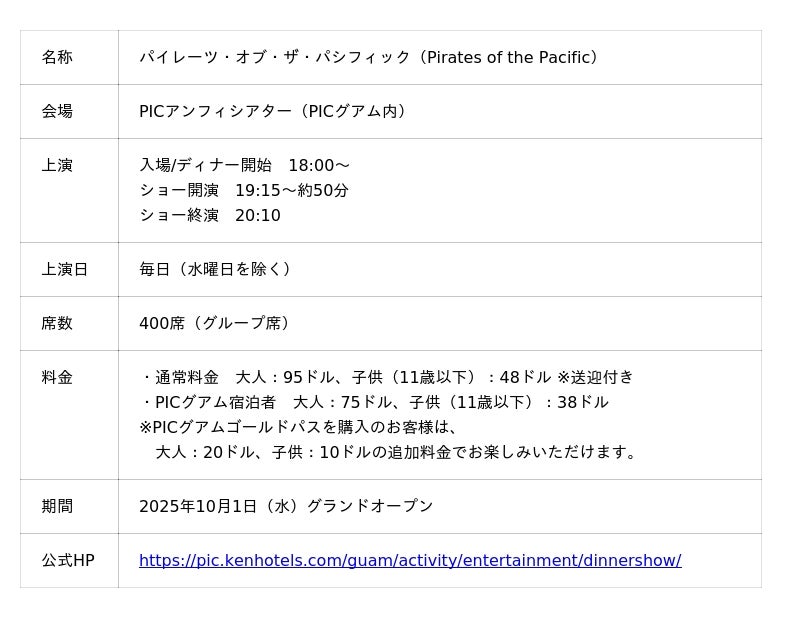 ショープロデューサーのタフィー・ニコラスとショーディレクターのマリオ・エスパーニャは、「PICのディナーショーは長年にわたり、グアムの代表的なアトラクションのひとつでした。だからこそ、これまで以上にパワフルに復活させることが重要でした。ストーリーや演出を作り上げ、家族で笑って盛り上がれる、大胆で忘れられないショーに仕上がっています。クラシックな海賊冒険に、グアムの文化とスピリットを融合させたエンターテイメントをお楽しみください。」と述べております。