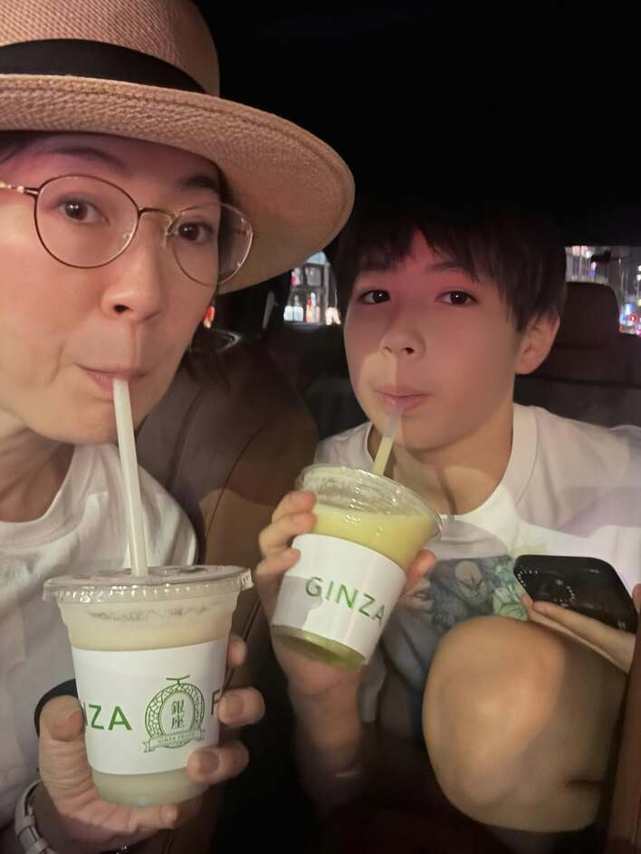 メガネ姿でハットをかぶる寺島さんとTシャツ姿の眞秀さんは、車の中でドリンクを飲みながらパシャリ。寺島さんによると、「眞秀はメロン。私は梨。どちらも美味でございました!」と、それぞれ違う味を堪能したようです。