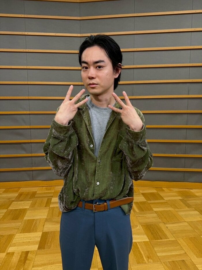 続いては、菅田さんが『サン!シャイン』に登場。両手の指を3本ずつ立てて、ギャルピースのような可愛らしいポーズを見せています。