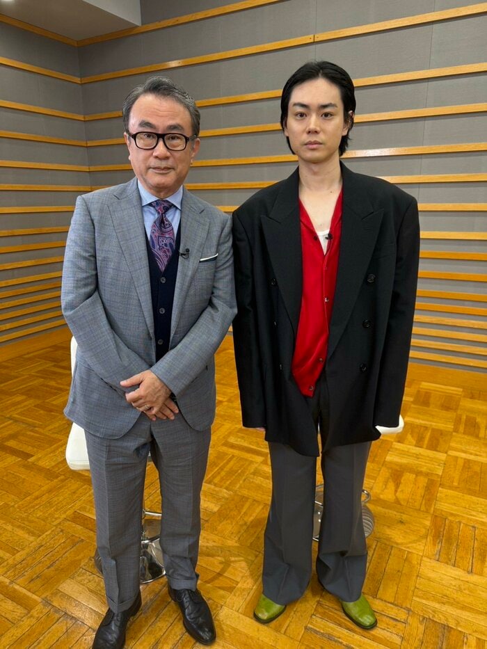 最後は、菅田さんと三谷さんが『イット!』に登場。菅田さんは衣装を着替え、黒いジャケットに真っ赤なインナーとグリーンの靴を合わせた、先ほどまでとは一味違うスタイルを見せています。